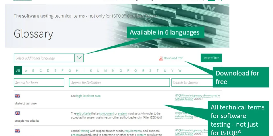 I would like to send you the one-stop shop for software testing technical terminologies and glossaries. This page present you the concepts, terms and definitions designed to help you communicate in the software testing and related disciplines.